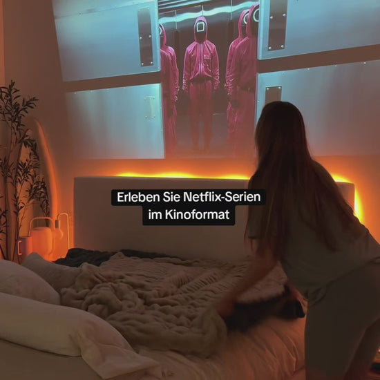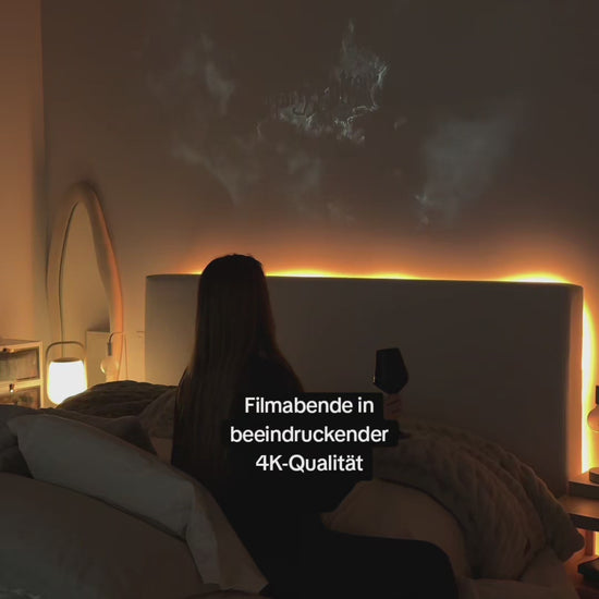 Großartiges Bild! Ich kann Filmabende direkt von meinem Bett aus genießen, und es ist toll, dass sich das Bild automatisch korrigiert, wenn es schief hängt. -